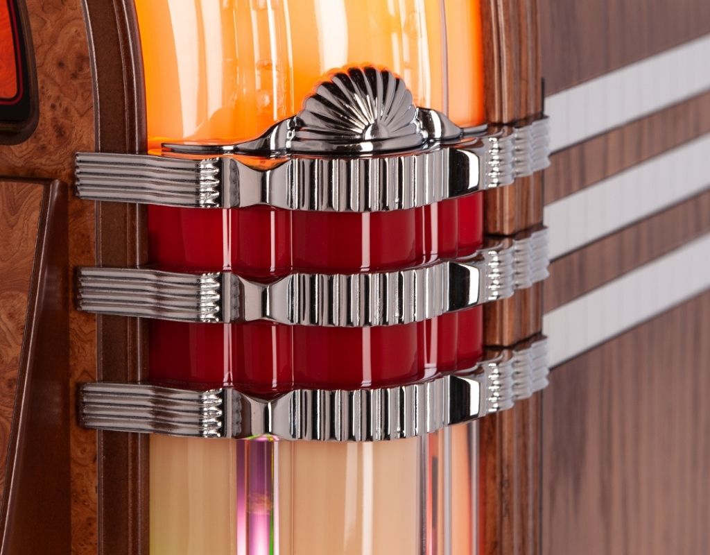 Bentley-Style Chrome Grille: Enhance the front of your jukebox with a chrome grille situated behind the main latticed metalwork. This adds an extra layer of depth and shine to the cabinet, providing an unmistakable, premium nostalgic look.