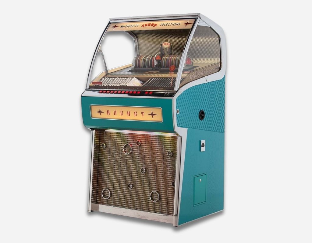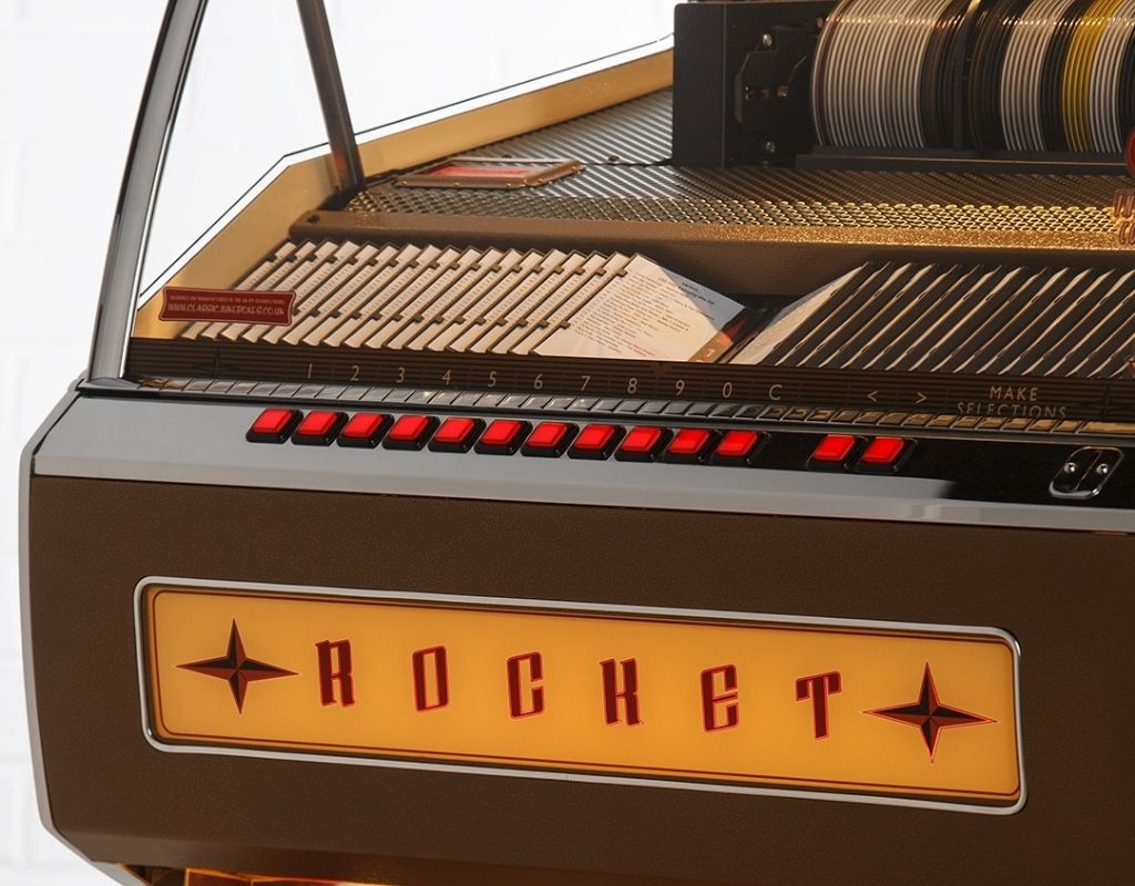The Rocket looks as pretty as the Oldsmobile car that inspired the song, with authentic 50s styling from cabinet to lettering. Under the hood is the 80 CD mechanism, 300 watt stereo amp and five way speakers. Add remote control, coin operation and auxiliary input (which allows the connection of any music-playing device) and you've got a modern-day classic, all revved up and ready to go.