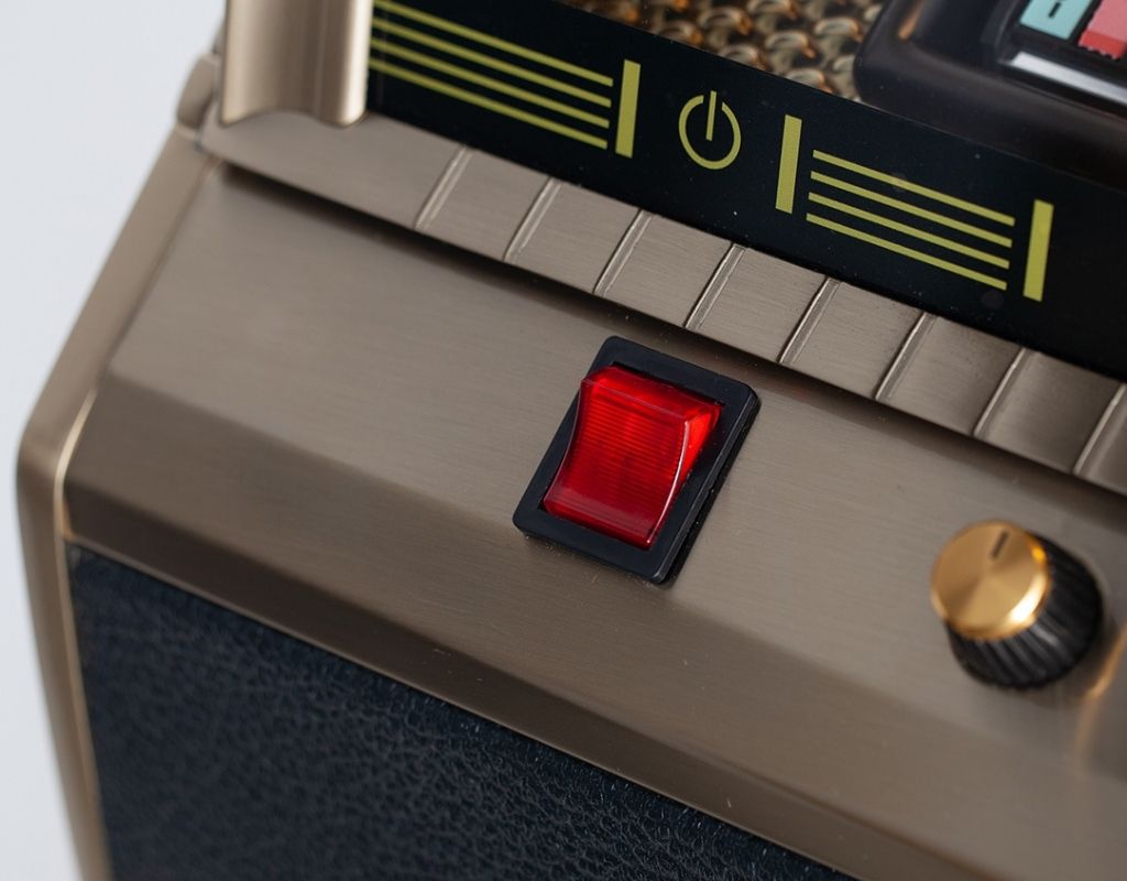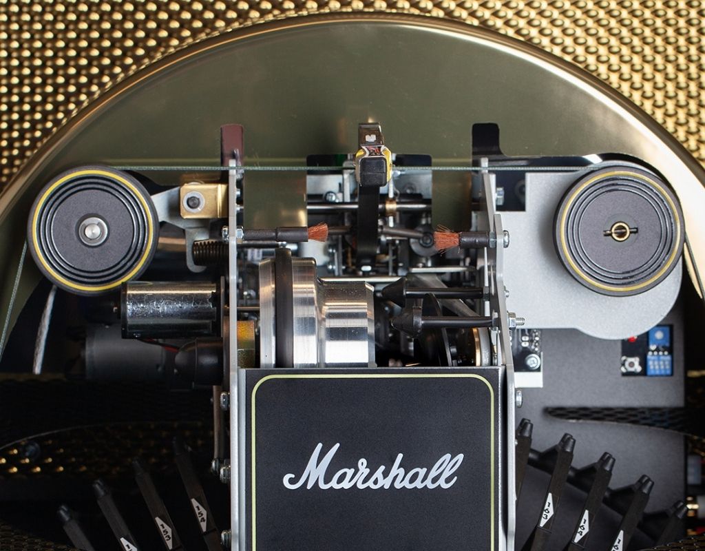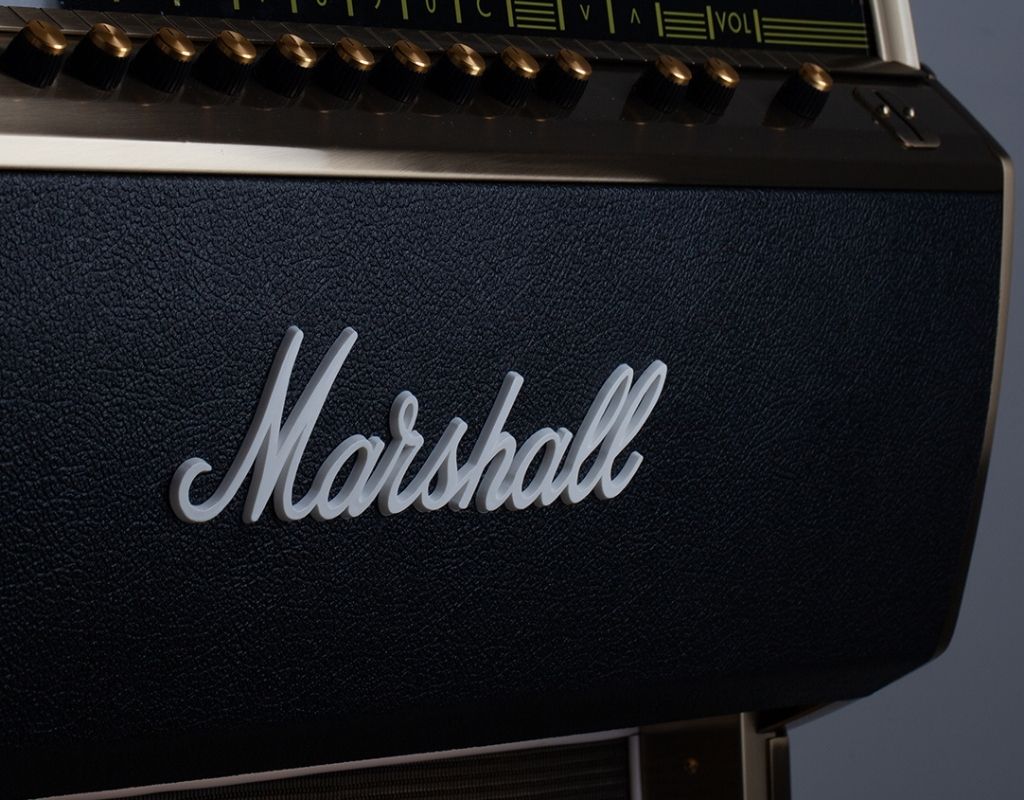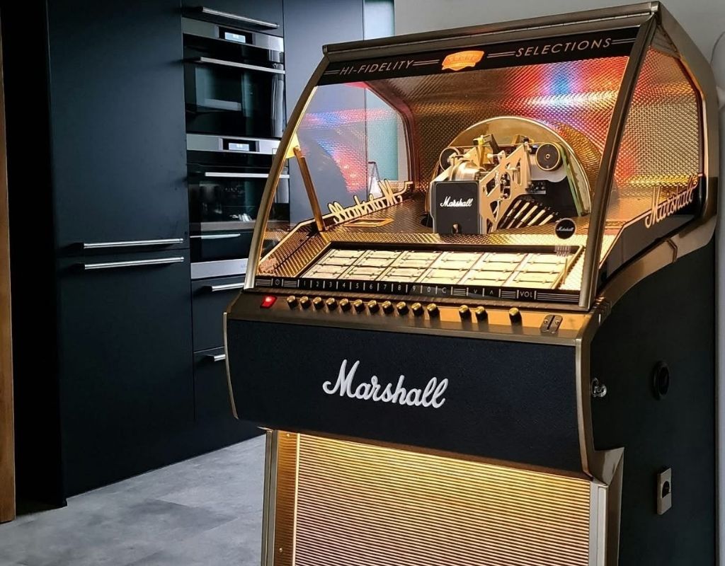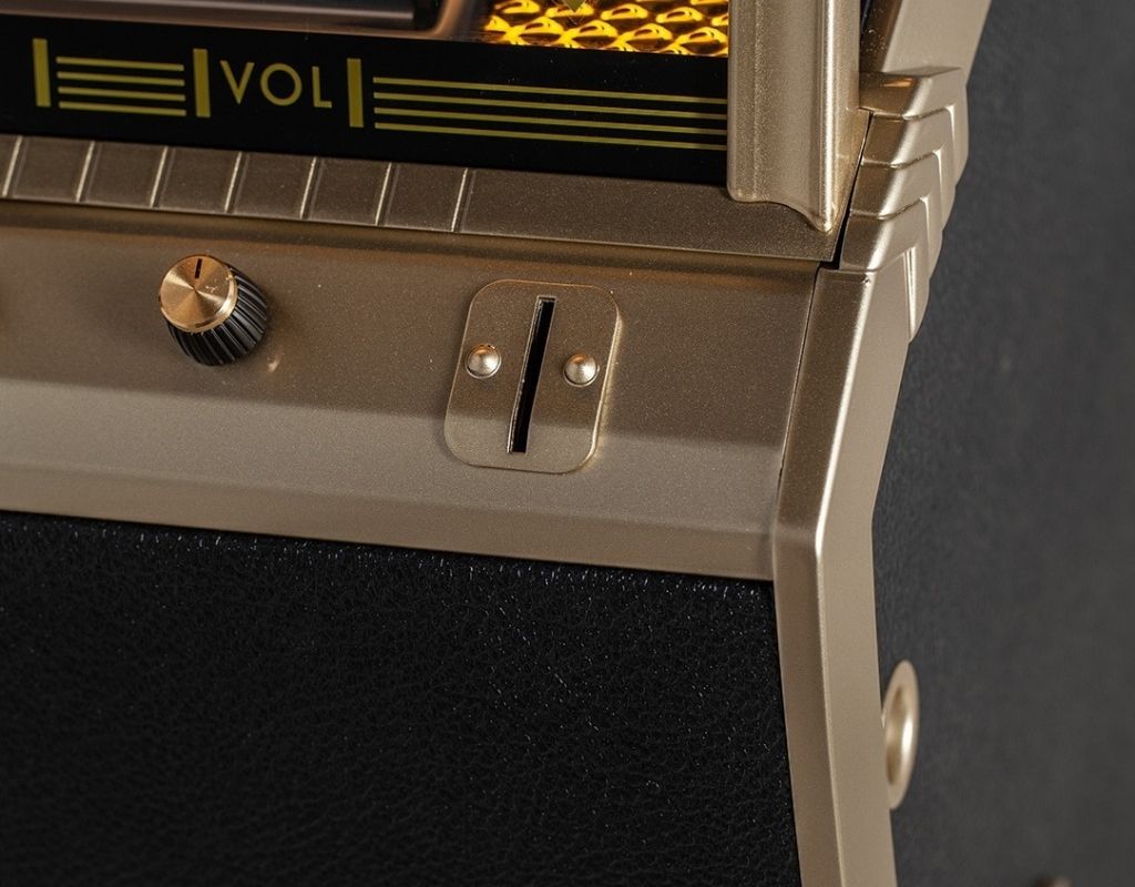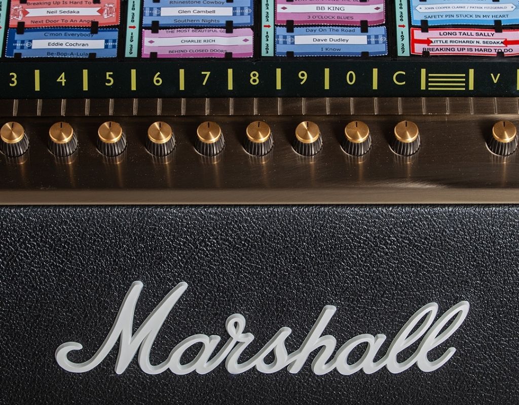 This beautiful Marshall version of the Rocket styled like one of Mashall's classic amps, giving it a fantastic and unique look. The jukebox itself is finished in striking, textured Tolex material and edged with a delicate gold trim. Each Marshall Vinyl Jukebox built is individually numbered and includes a certificate of authenticity.