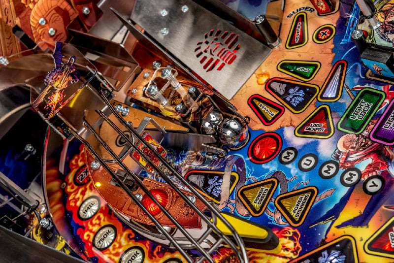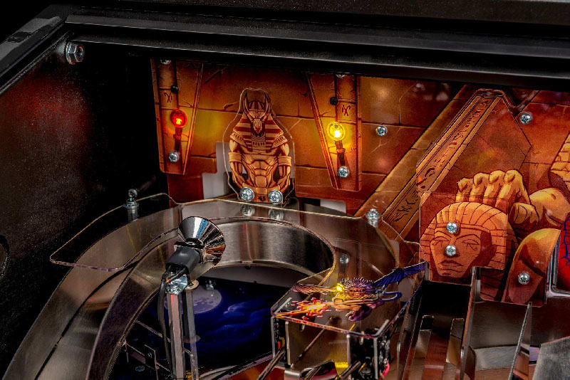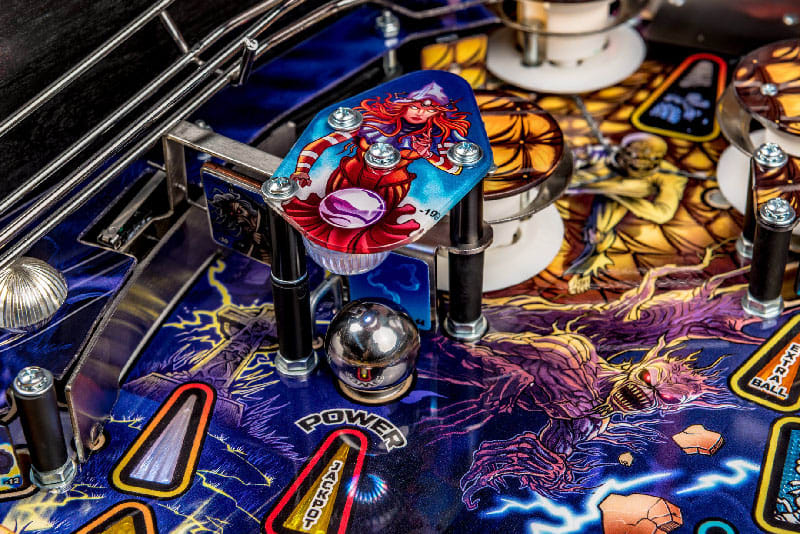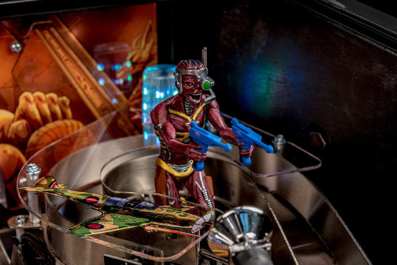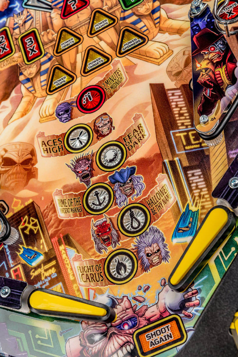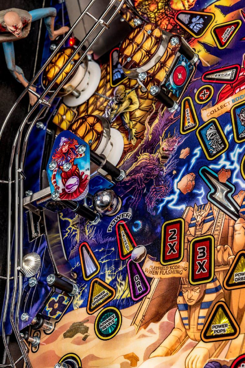 The premium version of Iron Maiden includes a whole host of additional features and embellishments to make it one of the hardest hitting heavy metal pinball machines of all time. Full RGB LED lighting covers the playfield, allowing any insert to display any colour. There are plenty of additional physical playfield features too. For example, the 'jump' ramp at the back of the playfield can lift to reveal a hidden additional scoop shot that leads to the underworld, a motorised guardian that can reveal the way to a hidden tomb. The game even features pinball's first ever 'hit detecting' newton ball assembly.