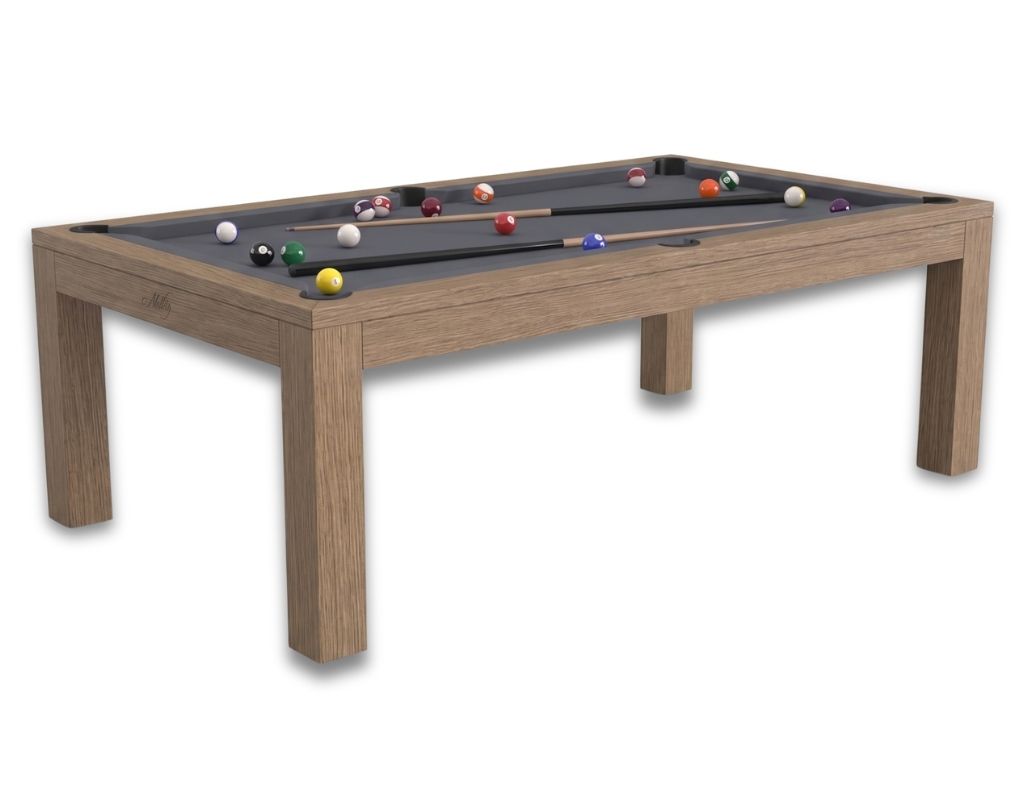 The Montfort Dinard brings world-class French craftsmanship to the classic English or American Pool experience. Part of the renowned Montfort design range, this 7ft table delivers authentic pub-style play using 2” balls and a 1 7/8” cue ball. Built with a robust steel frame and drop pockets (with an optional ball return), it features a clever 3-piece design. The sectional slate and three-piece dining top ensure it fits easily into most rooms while maintaining a professional playing surface. When not in use, the hidden pool table is completely concealed by the dining tops.