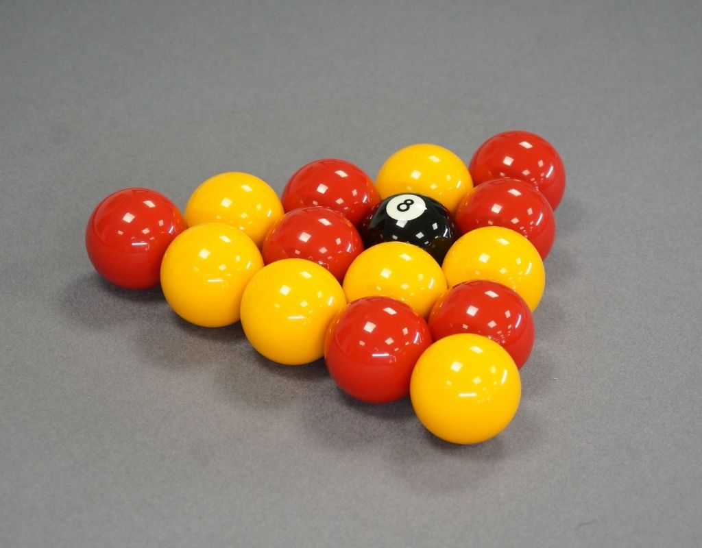 Super Aramith Pro Cup Reds and Yellows, every ball is crafted precisely so that each ball weighs within 1 gram of each other. Supplied with a spotted 1" cue ball. This ball set is the choice for the majority of English Pool competitions.