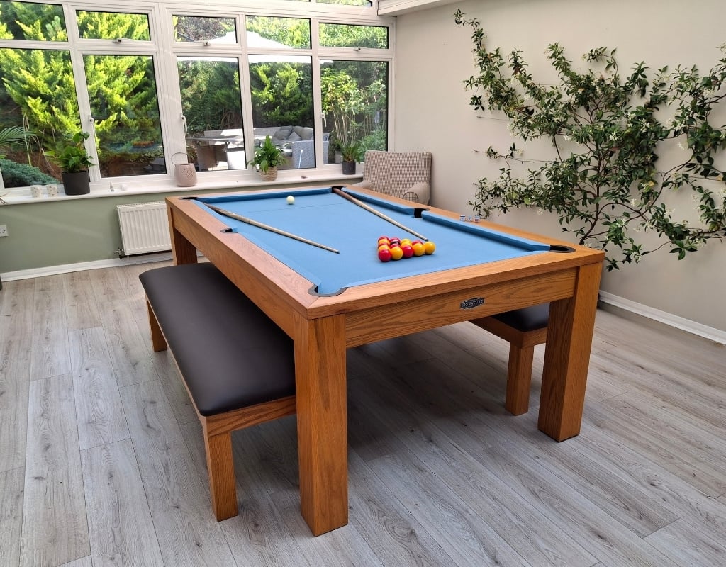 The Signature Chester Oak Pool Dining Table: 6ft, 7ft comes with Free Delivery and Installation, over £250 of Free Accessories, plus we are the exclusive retailers for this table. The Chester is an English pool table using 2” red and yellow balls as standard, with a one piece slate bed, available in 6ft and 7ft sizes. Check out our 6 easy steps to customise your Chester Pool Table plus FAQs below.
