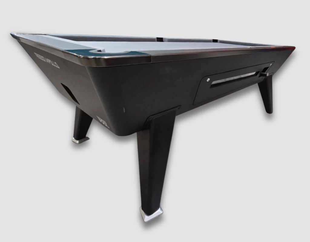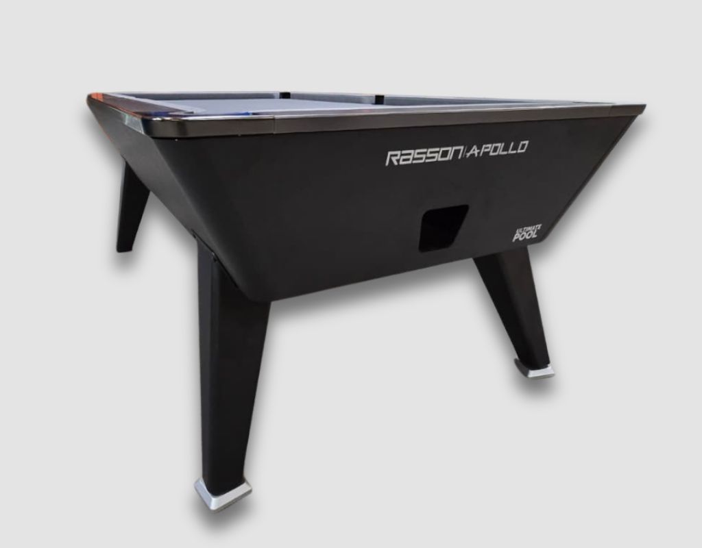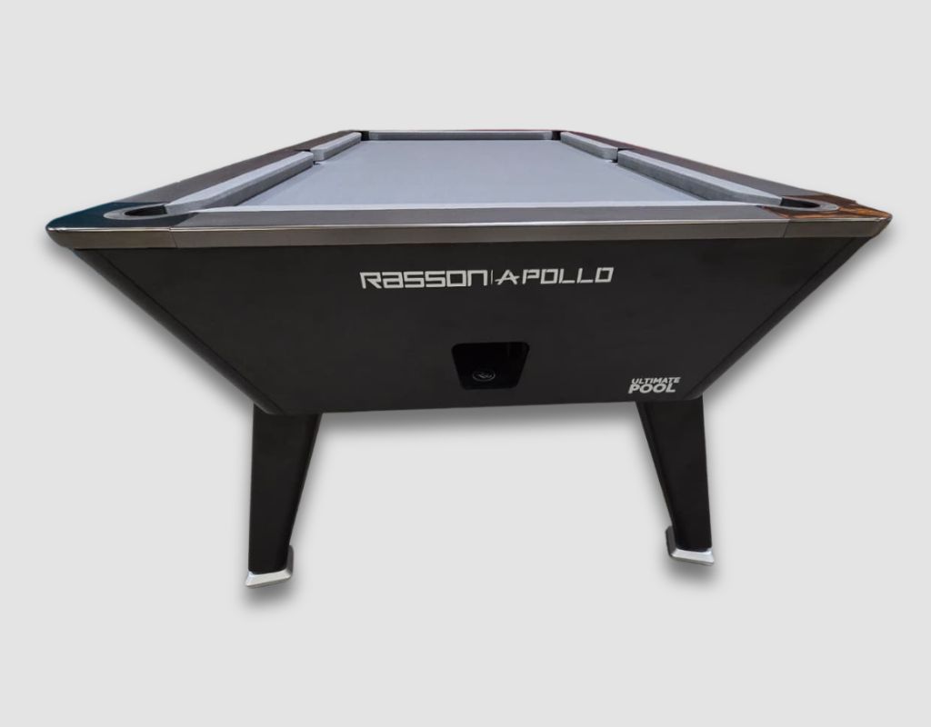 The Rasson Apollo Pool Table with Coin Mechanism comes is an English pool table using 2” red and yellow balls as standard, with a one-piece slate bed, available in a 7ft size with black and silver trim and Match Silver Cloth.