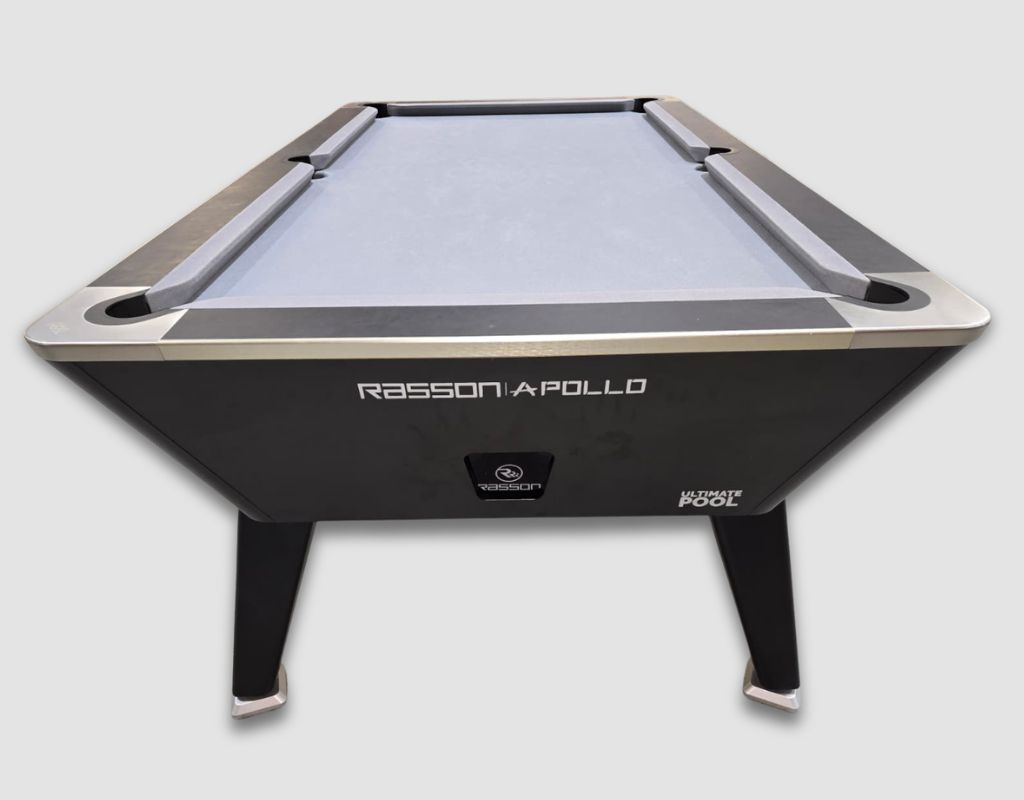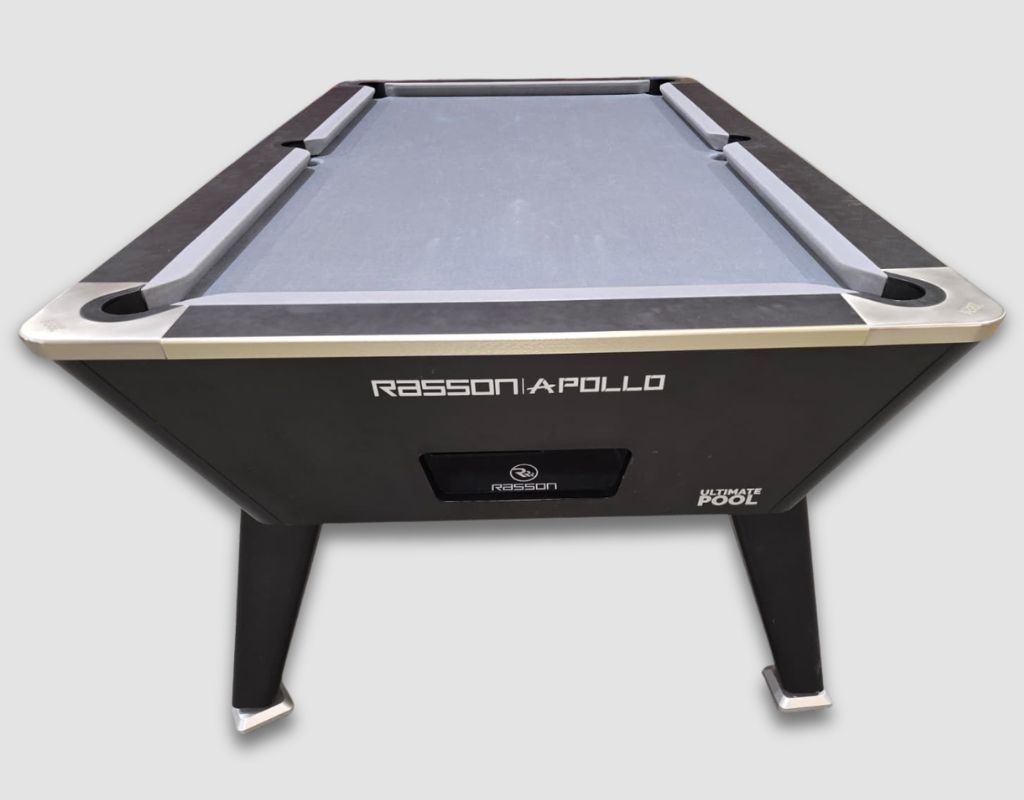 The Rasson Apollo Pool Table with Coin Mechanism comes is an English pool table using 2” red and yellow balls as standard, with a one-piece slate bed, available in a 7ft size with black and silver trim and Silver Cloth.