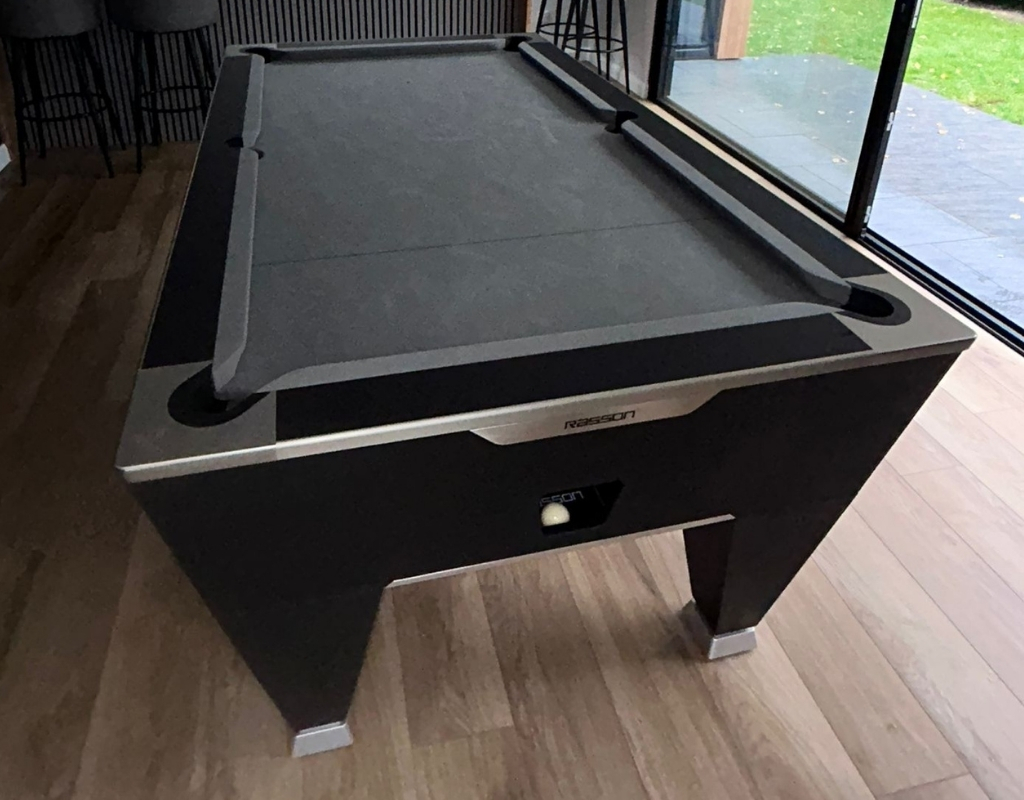 The Rasson Vanquish is an English pool table using 2” red and yellow balls as standard, with a one-piece slate bed, available in 7ft size. This table is finished in Black and is fitted with an Superfine Grey Cloth.