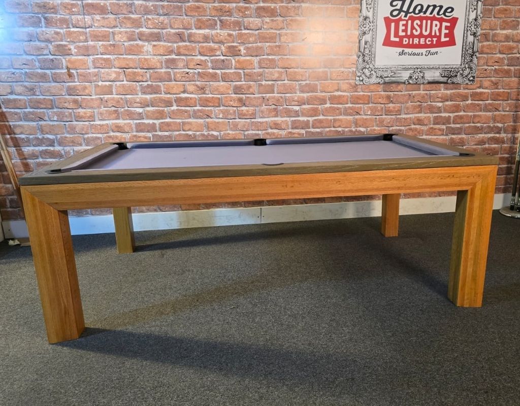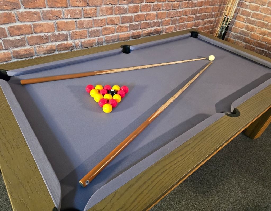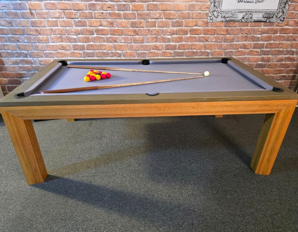 The Anderson is an English pool table using 2” red and yellow balls as standard, with a one piece slate bed, available in 7ft size, Oak finish with a Silver Mist top frame & with a Smart Silver cloth.