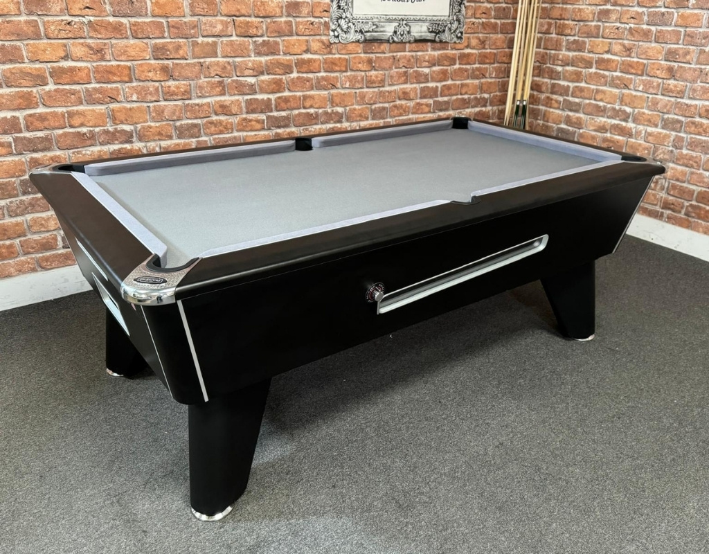 The table is a one-piece slate bed, English pool table which uses 2" reds and yellows balls as standard. Available in 7ft, with a Black finish and fitted with various Smart Silver Cloth.