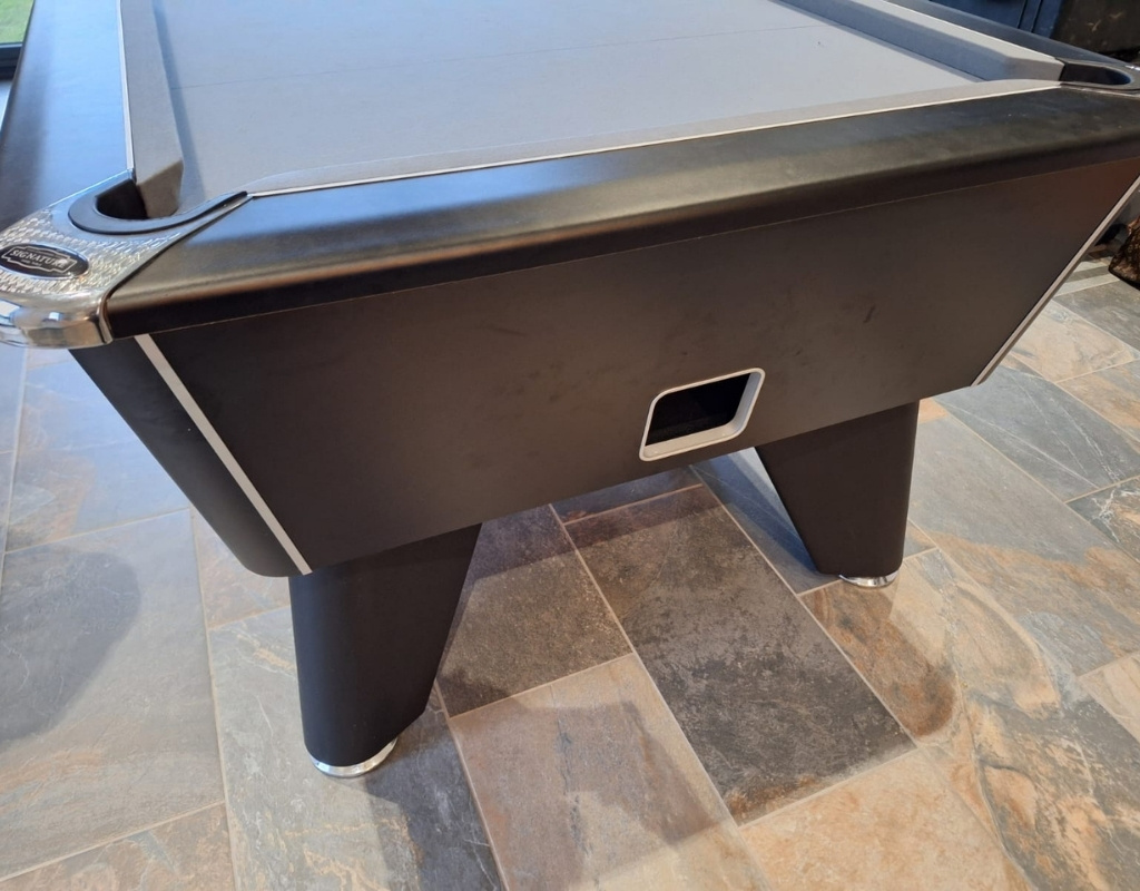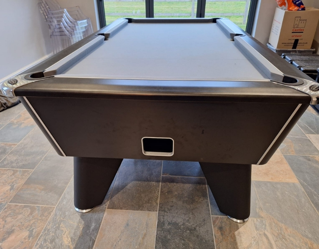 The table is a one-piece slate bed, English pool table which uses 2" Aramith reds and yellows balls as standard. Available in 7ft, with a Black finish and fitted with Smart - Silver Cloth.
