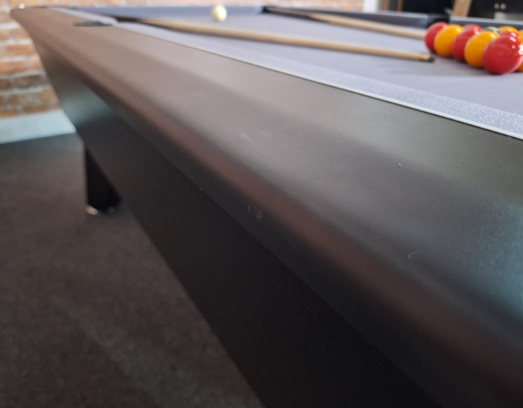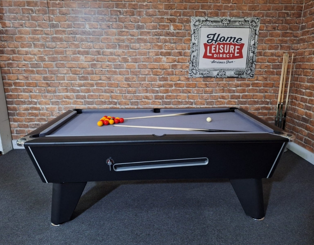 The table is a one-piece slate bed, English pool table which uses Competition reds and yellows balls as standard. Available in 7ft, with a Black finish and fitted with Silver Cloth.