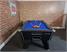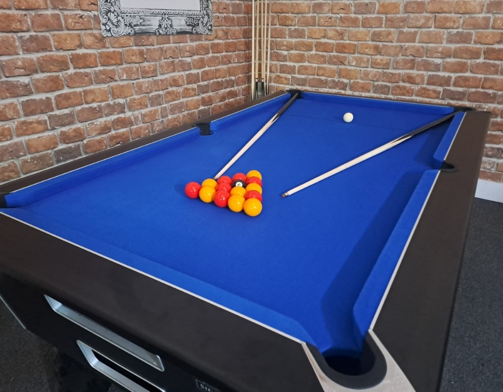 The table is a one-piece slate bed, English pool table which uses Competition reds and yellows balls as standard. Available in 7ft, with a Black finish and fitted with blue cloth.