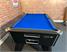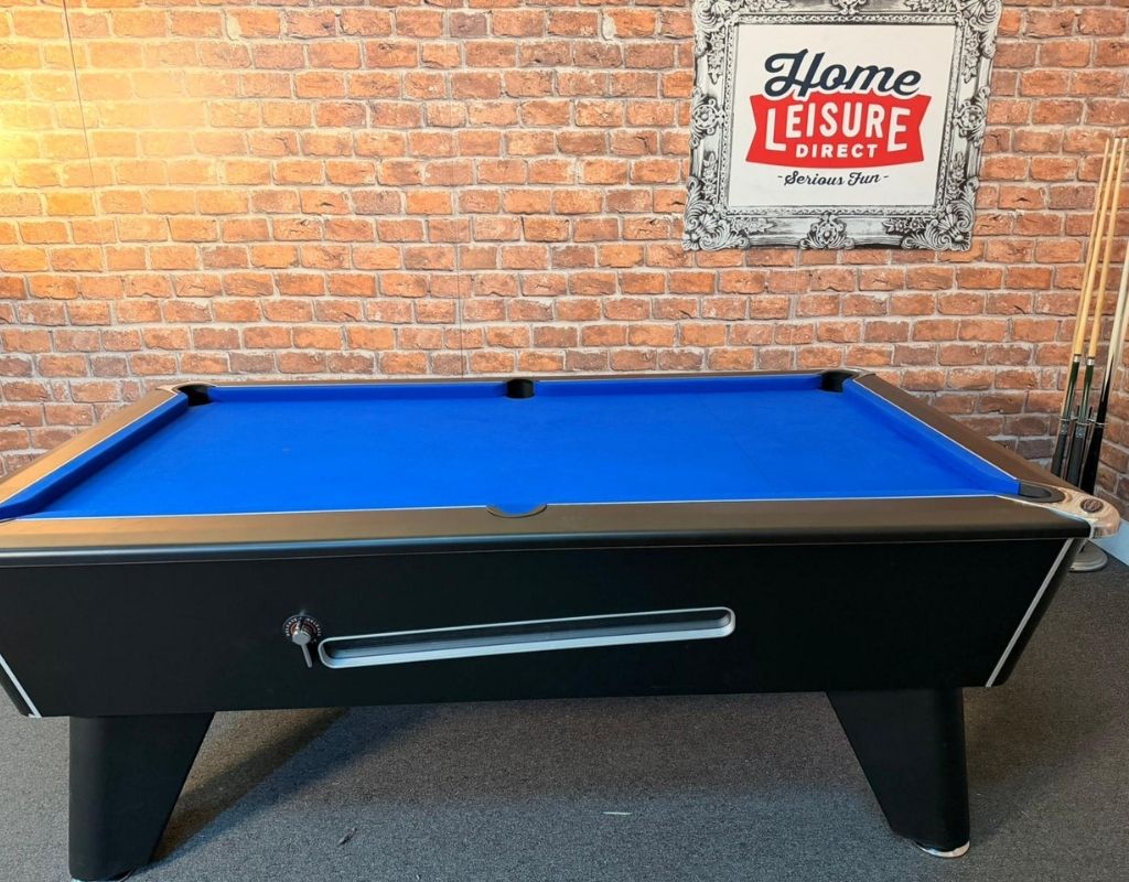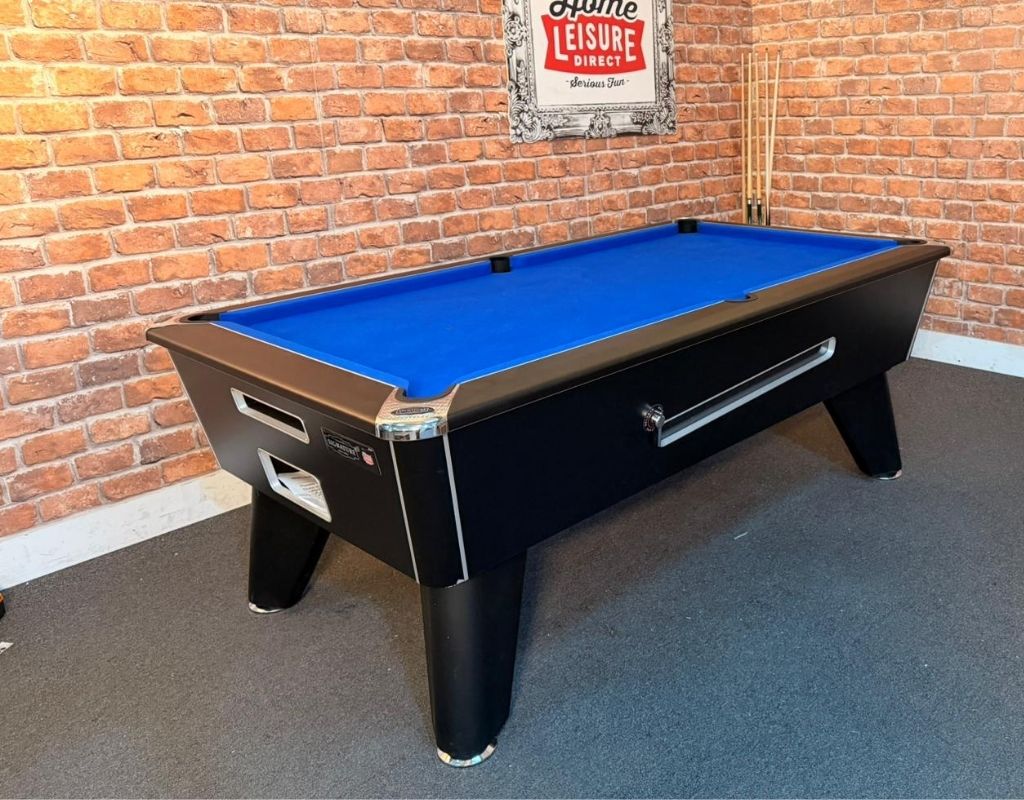 The table is a one-piece slate bed, English pool table which uses Standard reds and yellows balls as standard. Available in 7ft, with a Black finish and fitted with blue cloth.