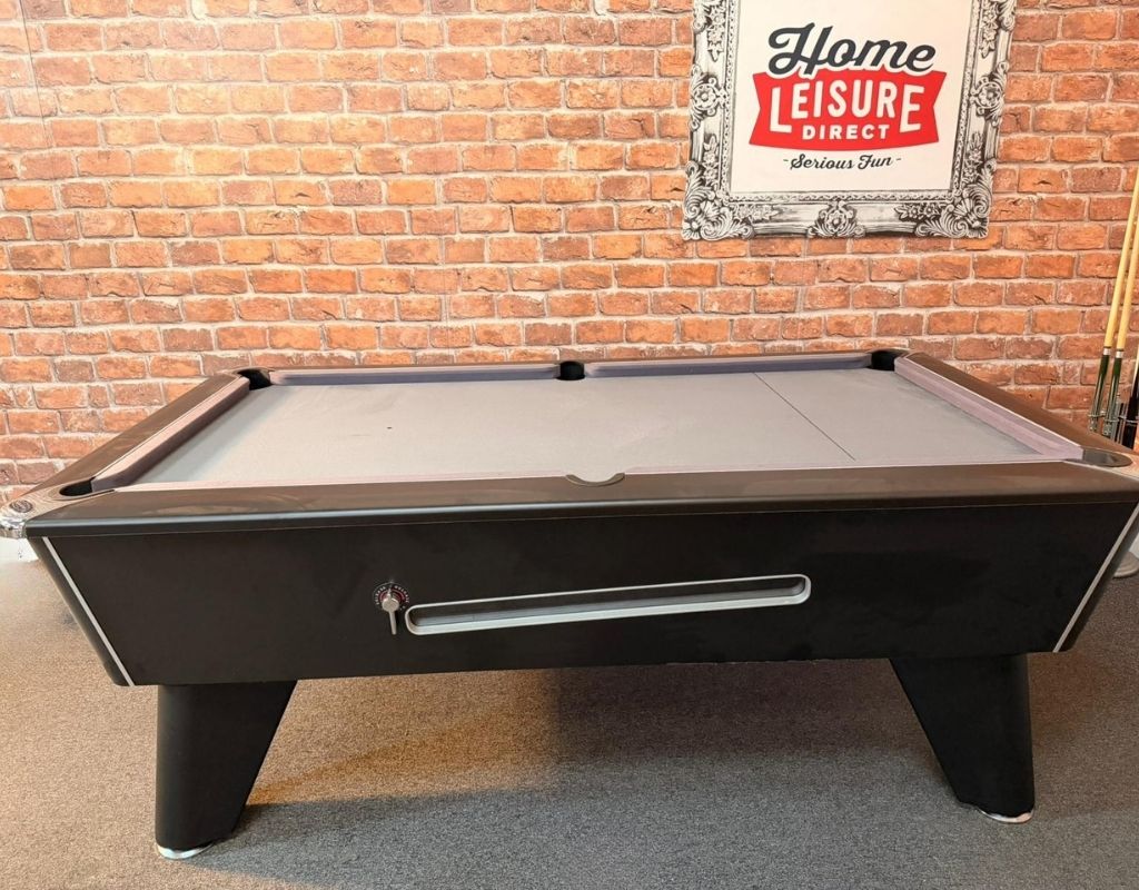 The table is a one-piece slate bed, English pool table which uses Standard reds and yellows balls as standard. Available in 7ft, with a Black finish and fitted with 6811 grey slate and smart silver cushions.