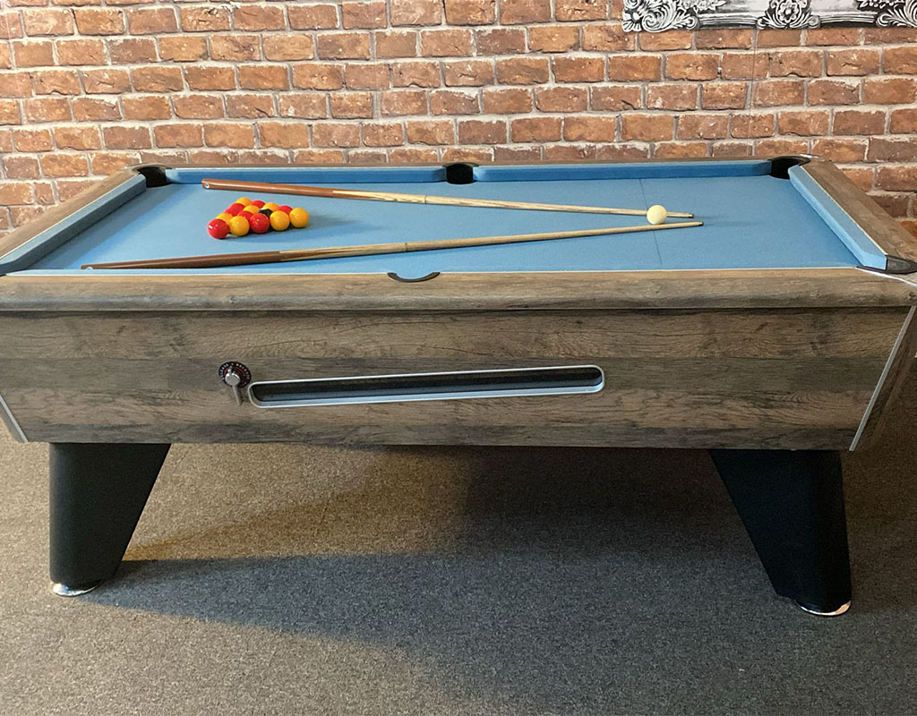 The table is a one-piece slate bed, English pool table which uses Standard reds and yellows balls as standard. Available in 7ft, with a Rustic Oak finish and fitted with Powder Blue cloth.
