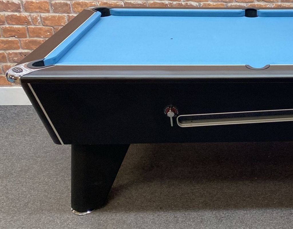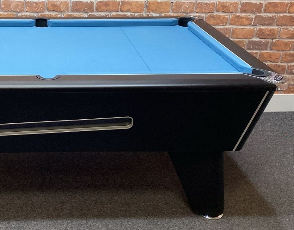 The table is a one-piece slate bed, English pool table which uses Standard reds and yellows balls as standard. Available in 7ft, with a Black finish and fitted with 861 Powder Blue.