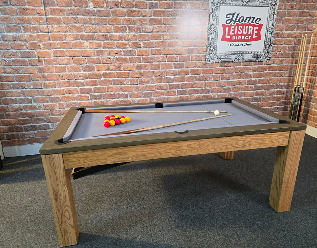 The Chester is an English pool table using 2” red and yellow balls as standard, with a one piece slate bed. Available in 6ft size, finished with a Silver Mist top frame with Oak Cabinet and legs. It then has Smart Silver cloth.