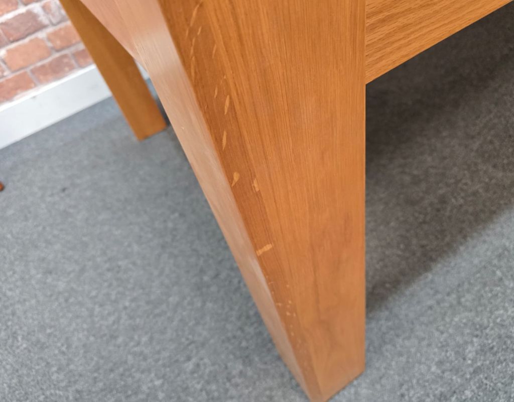 - Old oak style finish that has a lot of filler style patterns across the whole table.