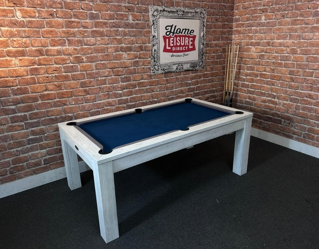 The Chester is an English pool table using 2” red and yellow balls as standard, with a one piece slate bed, available in 6ft size and finished in White Oak, and fitted with slate blue cloth and Silver Cushions.
