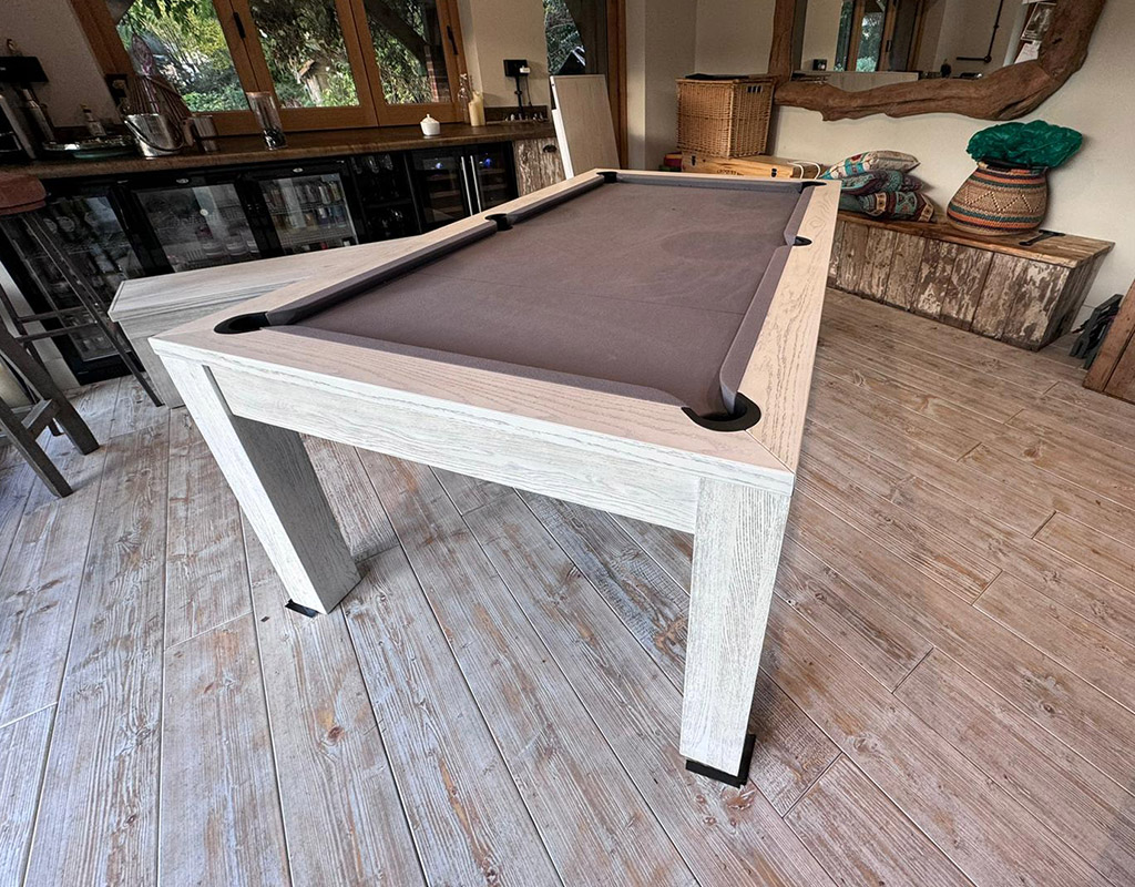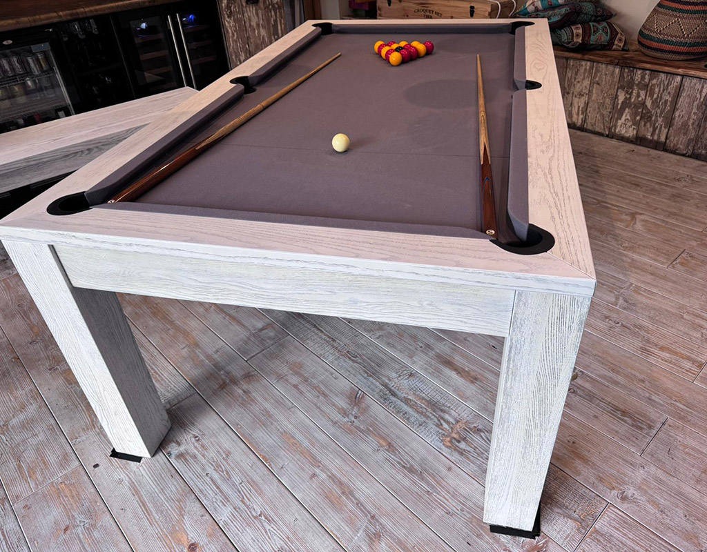 The Chester is an English pool table using 2” red and yellow balls as standard, with a one piece slate bed, available in 7ft size and finished in White Oak, and fitted with Smart - Silver cloth.
