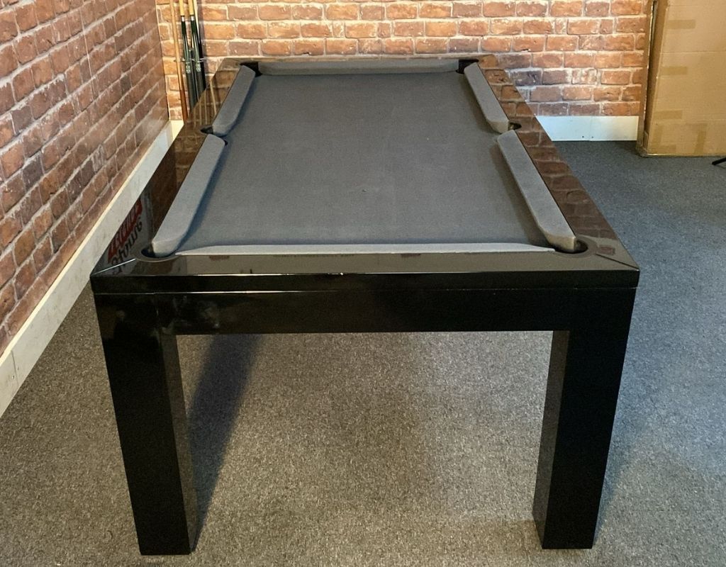 The Hawkes is available as an English pool table using 2” red and yellow balls, with a one-piece slate bed, this table is 6ft in size. Finished in High Gloss Black with a Smart - Pewter cloth.