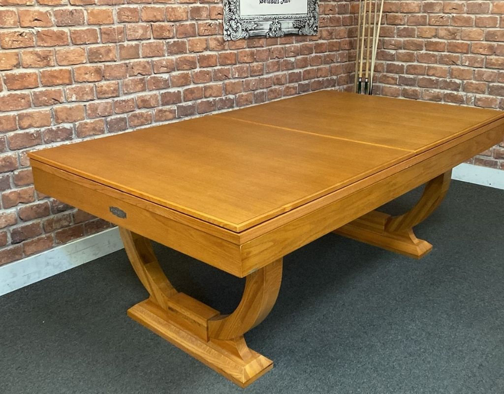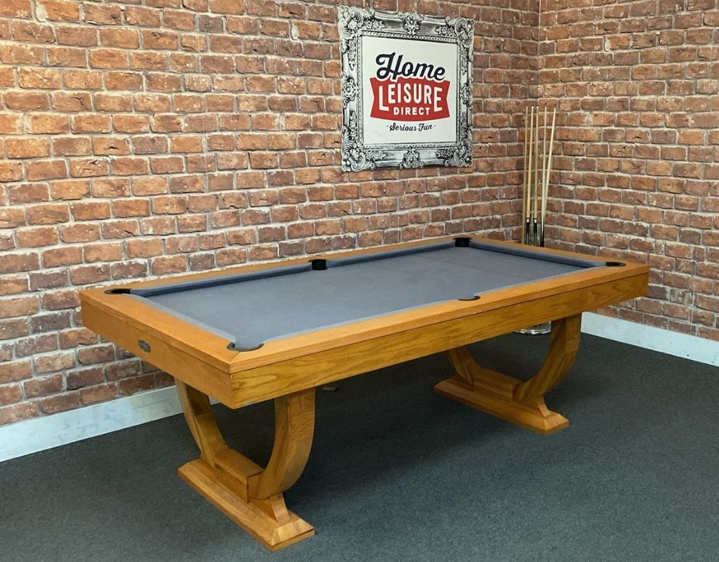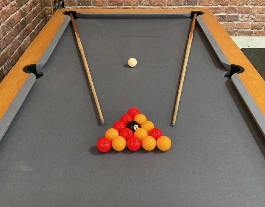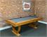 The Huntsman is an English pool table using 2” red and yellow balls as standard, with a one piece slate bed, available 6ft. Solid Oak finish with Silver Cloth.