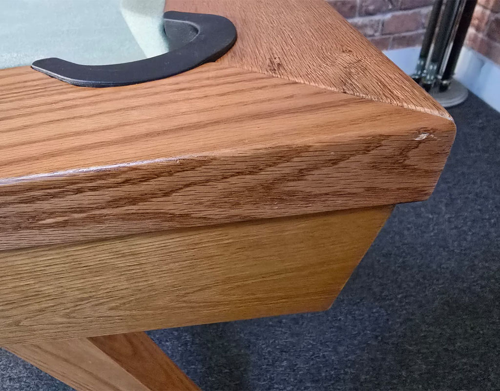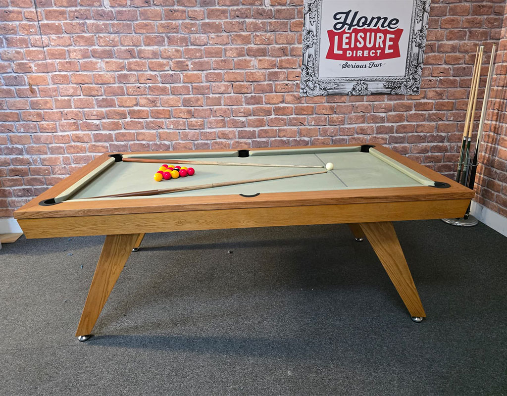This Sexton is an English pool table using 2” red and yellow balls as standard, with a one-piece slate bed, made in 7ft size. It is finished in Solid Oak, and is fitted with a Smart - Sage cloth.