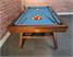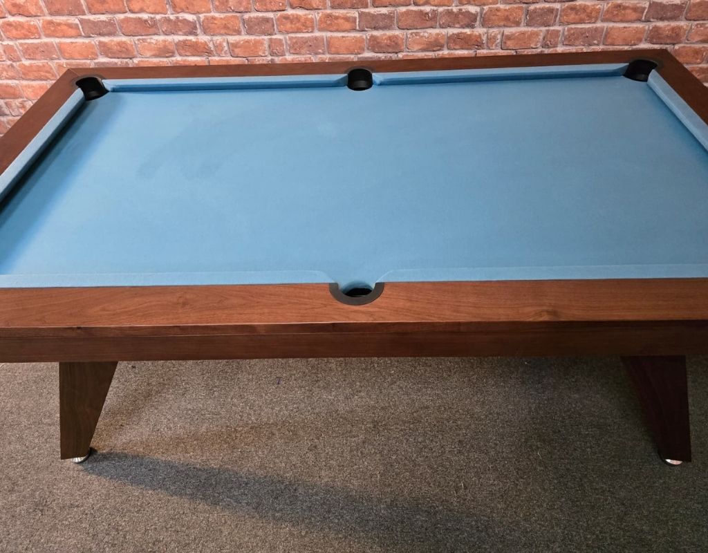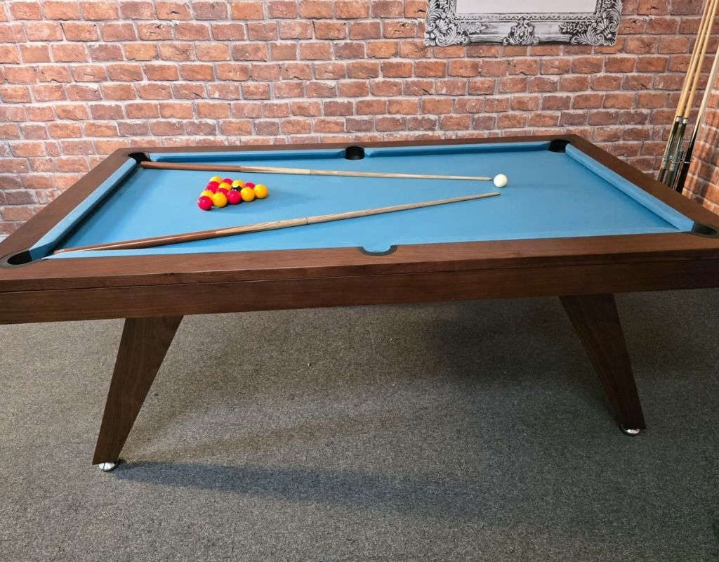 This Sexton is an English pool table using 2” red and yellow balls as standard, with a one-piece slate bed, made in 7ft size. It is finished in Solid Walnut, and is fitted with a Smart - Powder Blue Cloth.
