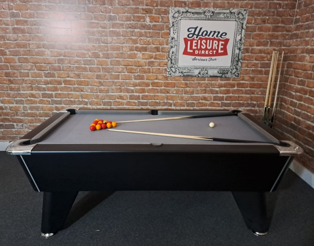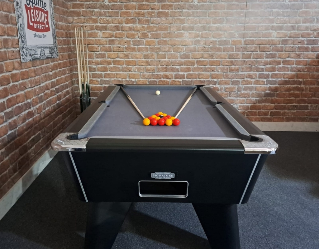 The Signature Tournament Pro Edition is an English pool table using 2” red and yellow balls as standard, with a one piece slate bed, available in 7ft size. This table is finished in Black with Chrome Feet and is fitted with a silver cushions and pewter slate.