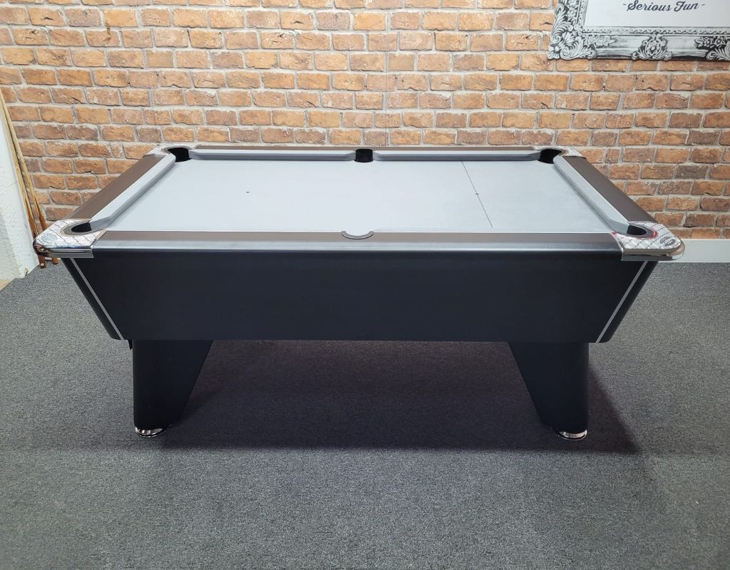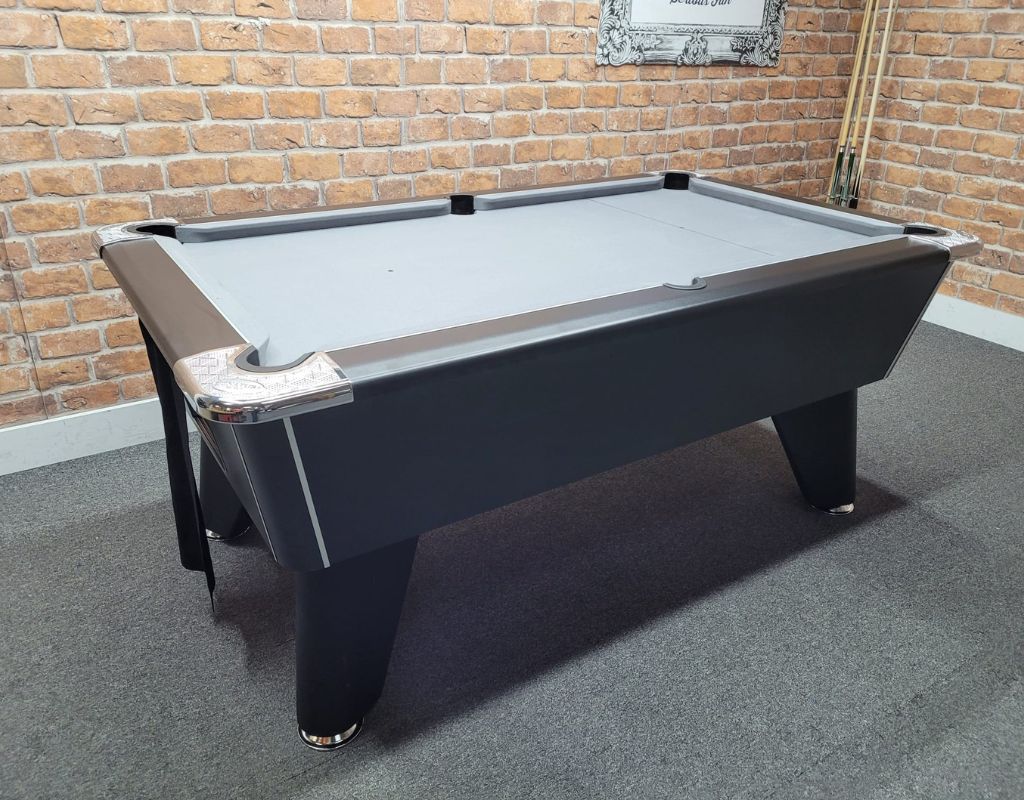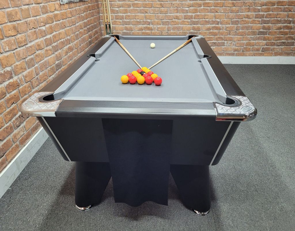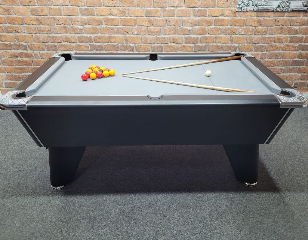 The Signature Tournament Pro Edition is an English pool table using 2” red and yellow balls as standard, with a one piece slate bed, available in 6ft size. This table is finished in Black with Chrome Feet and is fitted with a grey cloth.