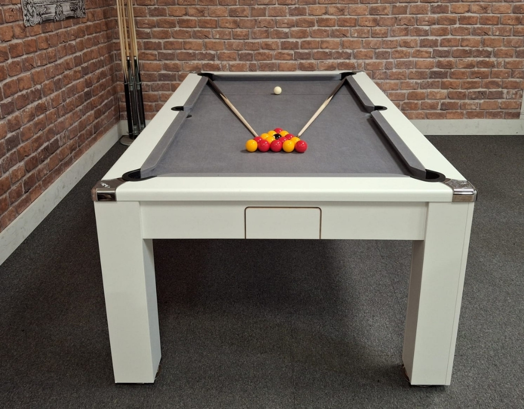 The pool table is supplied in 3 main parts: the cabinet, the slate and the legs. The legs bolt onto the cabinet. Once in place you can then place the slate inside the table, and then clip down the frame to secure. The slate and cabinet are extremely heavy, so if you opt to install the table yourself you will again need two strong people to carry it to your chosen location and assemble the table. Please note assembling a table correctly is a specialist job. If you are in doubt as to whether you will be able to complete the job satisfactorily yourself we recommend you have your new table professionally installed.