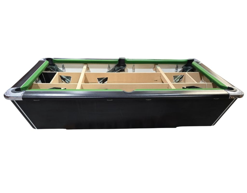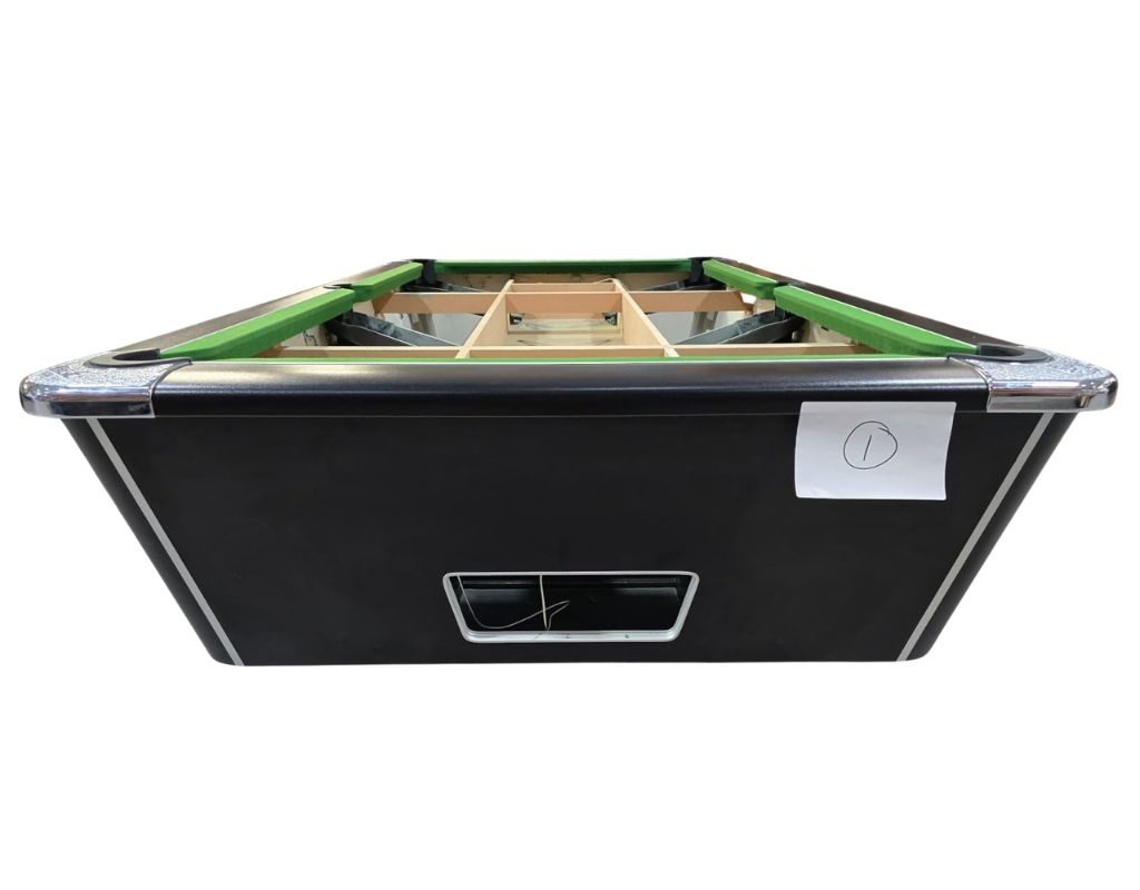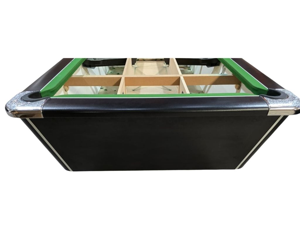 This Supreme Winner is an English pool table using 2” red and yellow balls as standard, with a one-piece slate bed, made in 7ft size. It is finished in Black and will be re-fitted with a cloth of your choice.